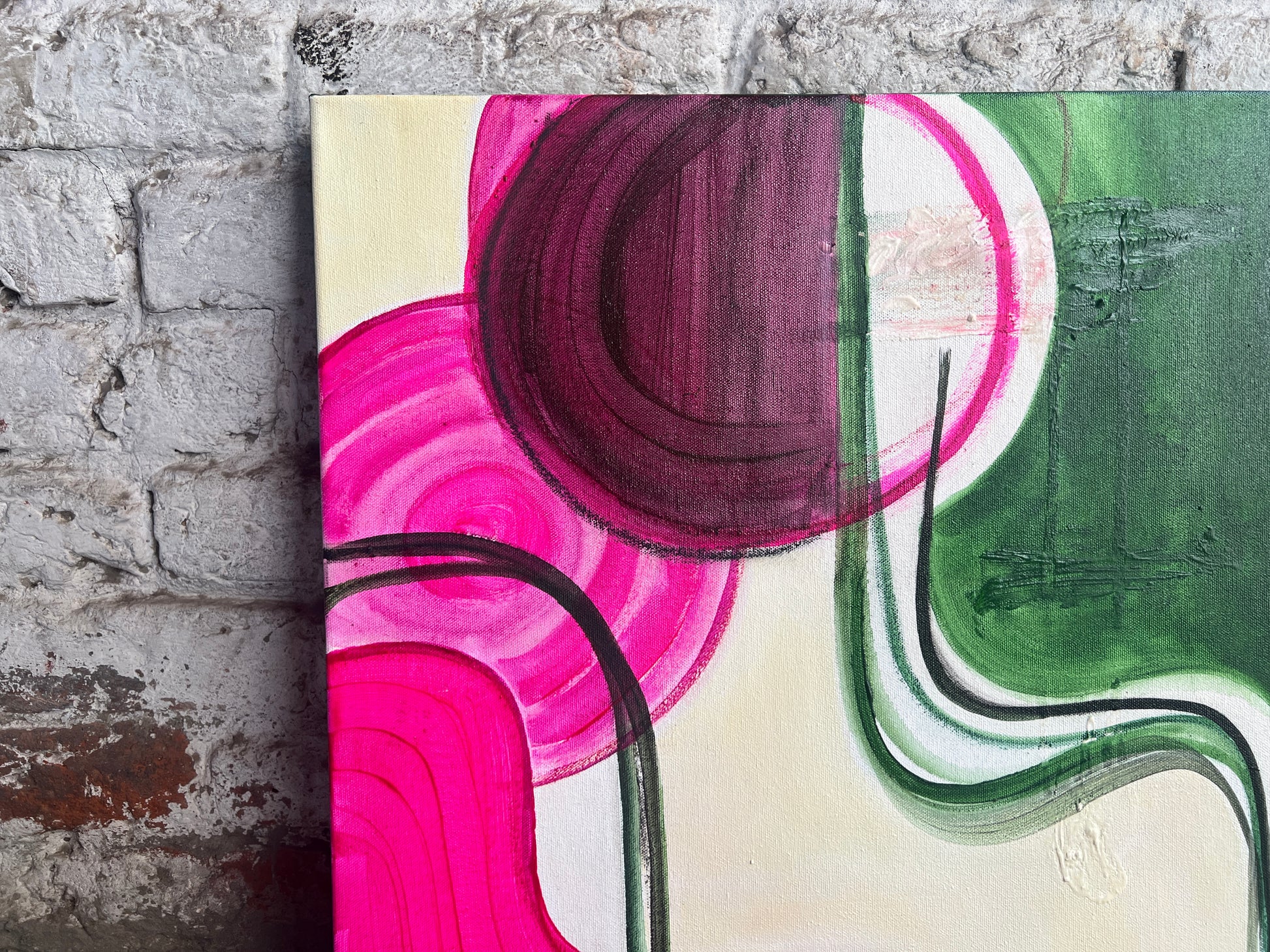 The composition centers around interconnected circles, each one fractured to represent the struggle and triumph of overcoming personal and societal limitations. The bold use of bright pink not only highlights the strength and resilience of the female experience but also infuses the piece with a sense of empowerment and transformation.