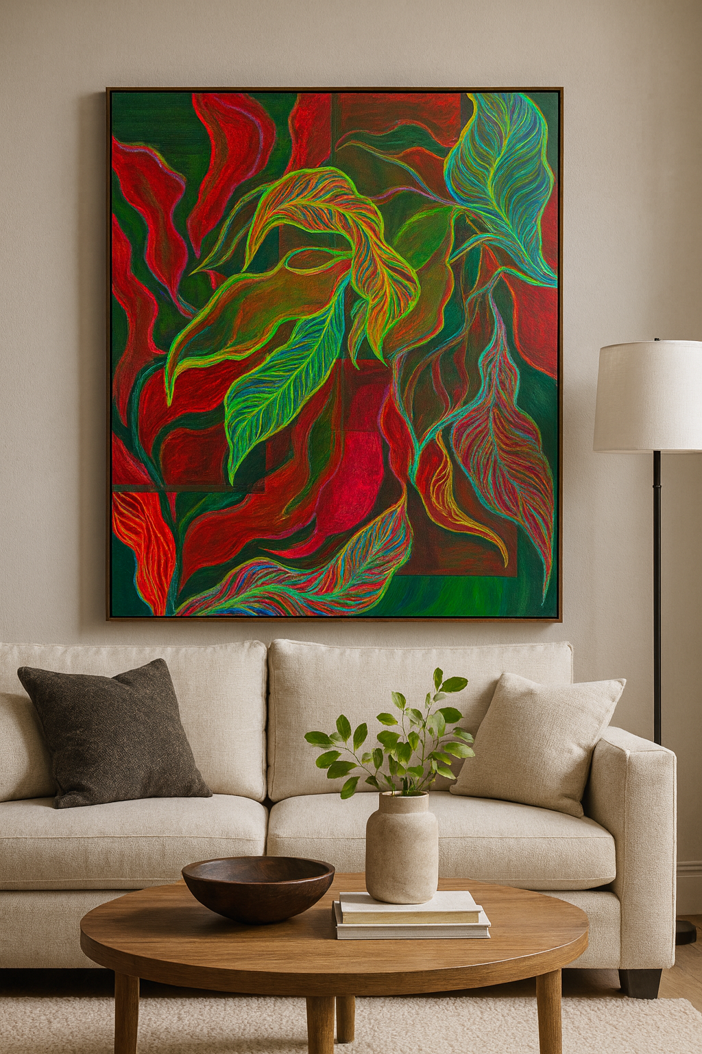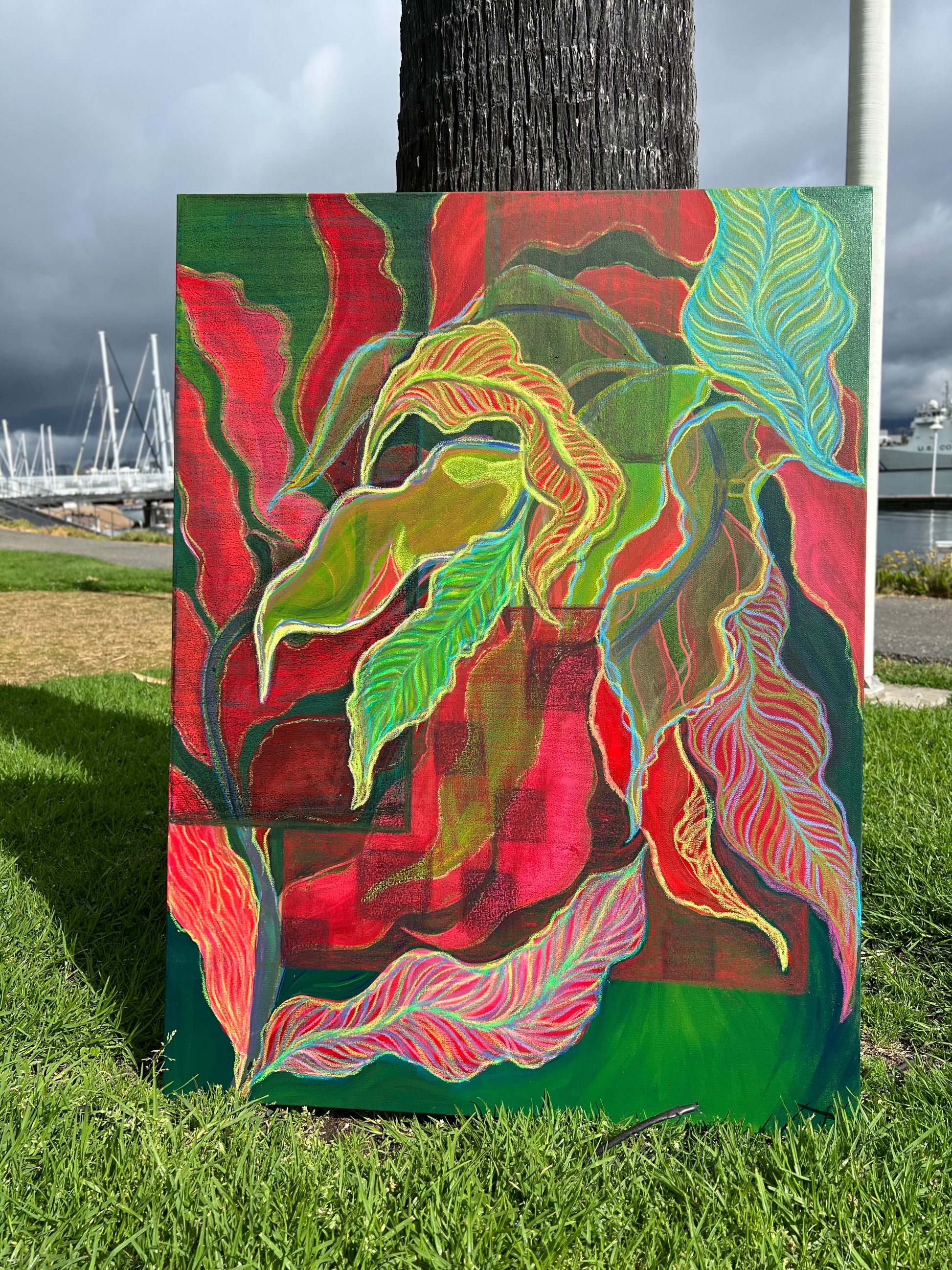 This piece is my way of letting color move freely—unconfined and unplanned. The sweeping layers of reds, greens, and turquoise came together almost like nature guiding my hand, reminding me of both chaos and calm. It carries the rhythm of growth and the pulse of transformation, but with an openness that feels unboxed like energy refusing to stay still. For me, it’s a reflection of freedom, of letting go, and of trusting the flow to take its own shape.