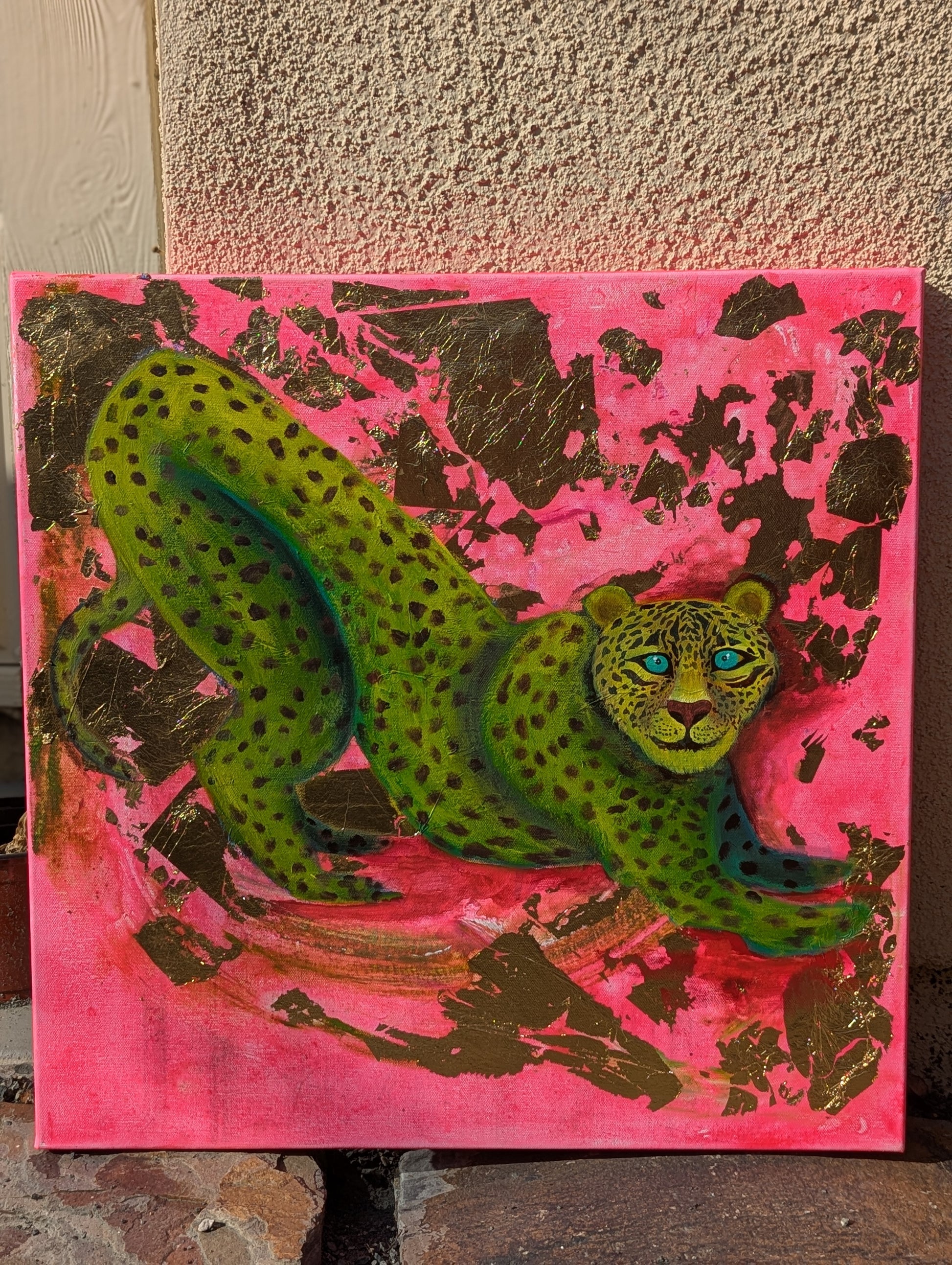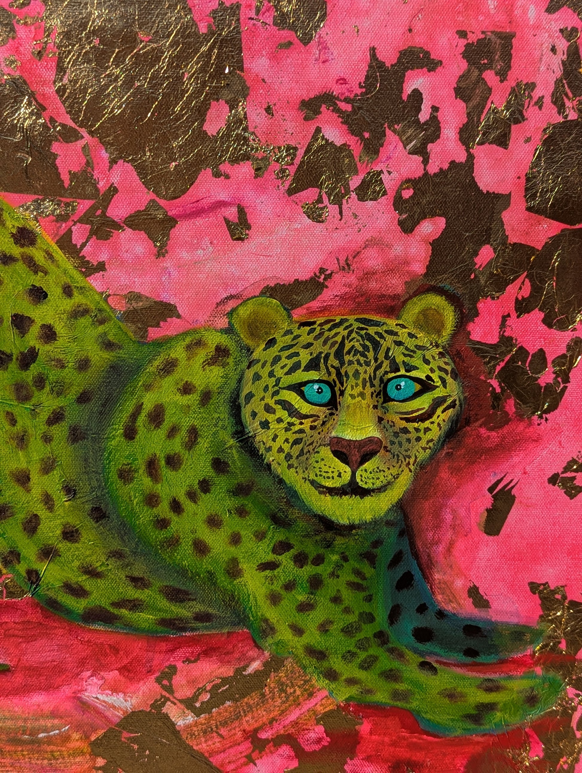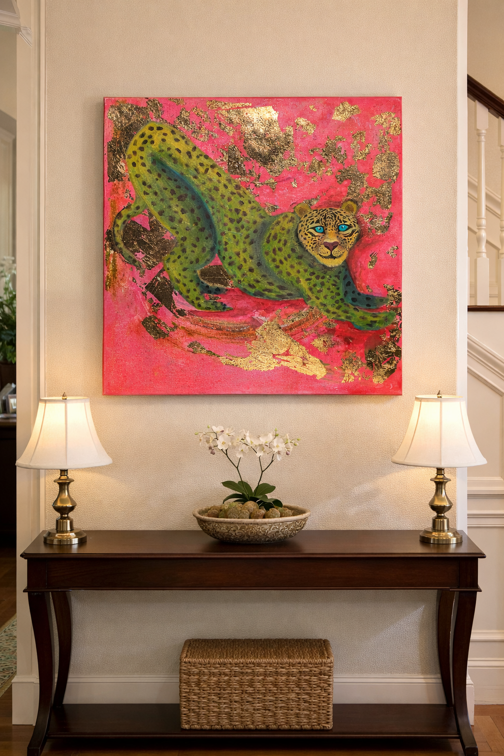 Created with acrylics and layered mixed media, this leopard carries a quiet healing energy rooted in stillness and strength. Emerging from vibrant pinks and grounding greens, the composition invites emotional renewal, balance, and calm presence. Hand-applied gold leaf catches the light like small moments of hope, shifting gently as the day unfolds.